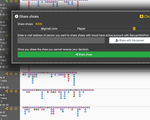 To share shoe you can do it from "Shoes list" or from the shoe details view. The option is marked with share icon. Type e-mail address of a person you want to share the shoe with and add email to share list of this shoe. You can add many emails. Each email must have account with Baccarat Win Pro.
